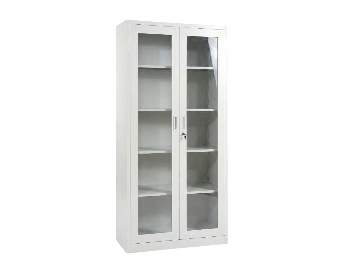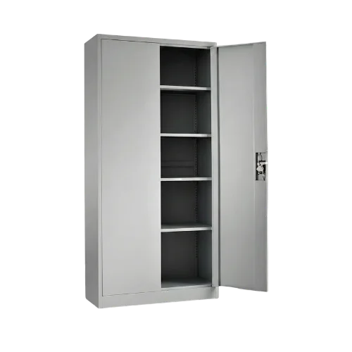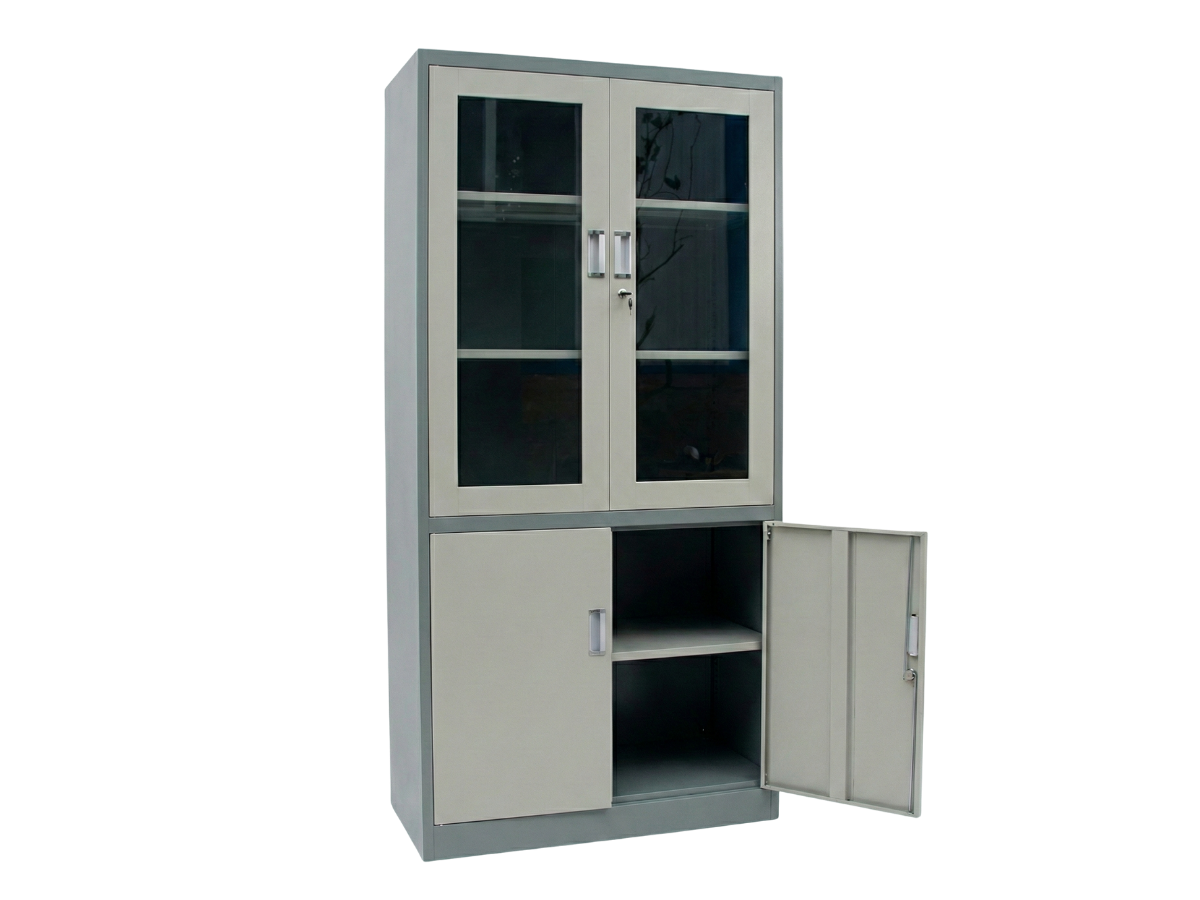 Fabricado en acero SAE1010 0,6mm. Pintura polvo de aplicación electroestática. Bicolor. Cerradura Españoleta de tres puntos cromada. 2 puertas batientes 4 bandejas interiores regulables.